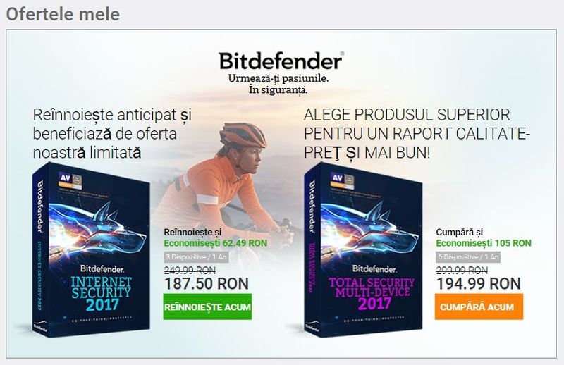 Mai am 69 de zile și trebuie să-mi reînoiesc abonamentul. Numai că am observat o ciudățenie. Dacă îl cumpăr prin intermediul aplicației Bitdefender Central, Internet Security 2017 pentru 3 utilizatori, vreme de 1 an, mă costă 187,50 lei. Dar cică să mă grăbesc, că e ofertă limitată.