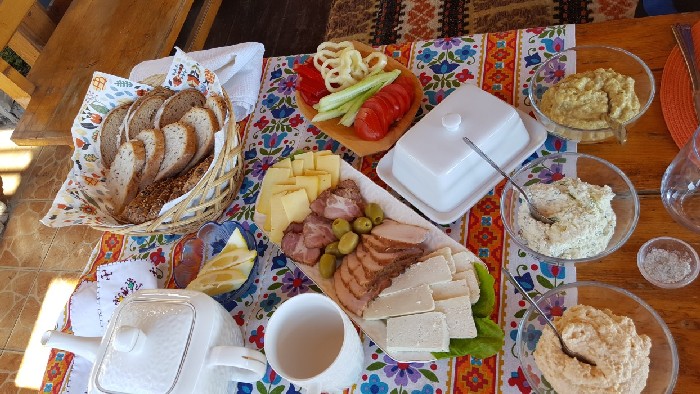 Chiar simt nevoia să explic puțin cam ce înseamnă un mic dejun la Aura’s Guest House. Ceai sau cafea, lapte, sucuri naturale, salată de vinete (cea mai buna salată mâncată de mine ever), două tipuri de cremă de brânză, brânză și cașcaval de Sadova, mușchiulet de porc (două tipuri), castraveți, roșii, ardei, unt și dulceață făcută în casă (căpșune, coacăze), miere și trei feluri de pâine.