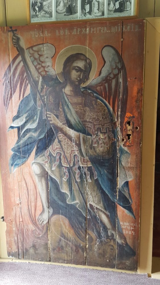 Mi-a atras atenţia o pictură datată 1884, înfăţişând un arhanghel biruind balaurul. Suportul este ciudat. Pare o uşă de lemn, fără clanţă, lipită de zidul bisericii, în interior. Mă lămureşte un călugăr. Da, este o postă uşă a lăcaşului şi a fost montată înăuntru pentru a păzi pictura de intemperii.